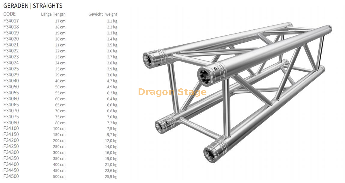 Avec une dimension extérieure de 29 cm, la série de fermes F34 de Global Truss est un système à 4 points qui a reçu l'approbation du TÜV.Ce système est l’un des plus utilisés en raison de sa capacité de charge idéale par rapport à son poids et à ses dimensions.Avec les fermes du système F34, des stands d'exposition, des aménagements de magasins, des toits de scène et d'autres applications extérieures peuvent tous être construits.Le système offre une portée maximale de 18 mètres.