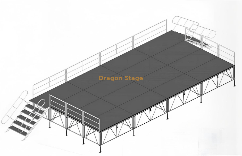 Accès : Les scènes standard comprennent des escaliers amovibles en aluminium, généralement dotés de marches en bois, pour permettre aux artistes et à l'équipe d'accéder en toute sécurité à la plate-forme surélevée.