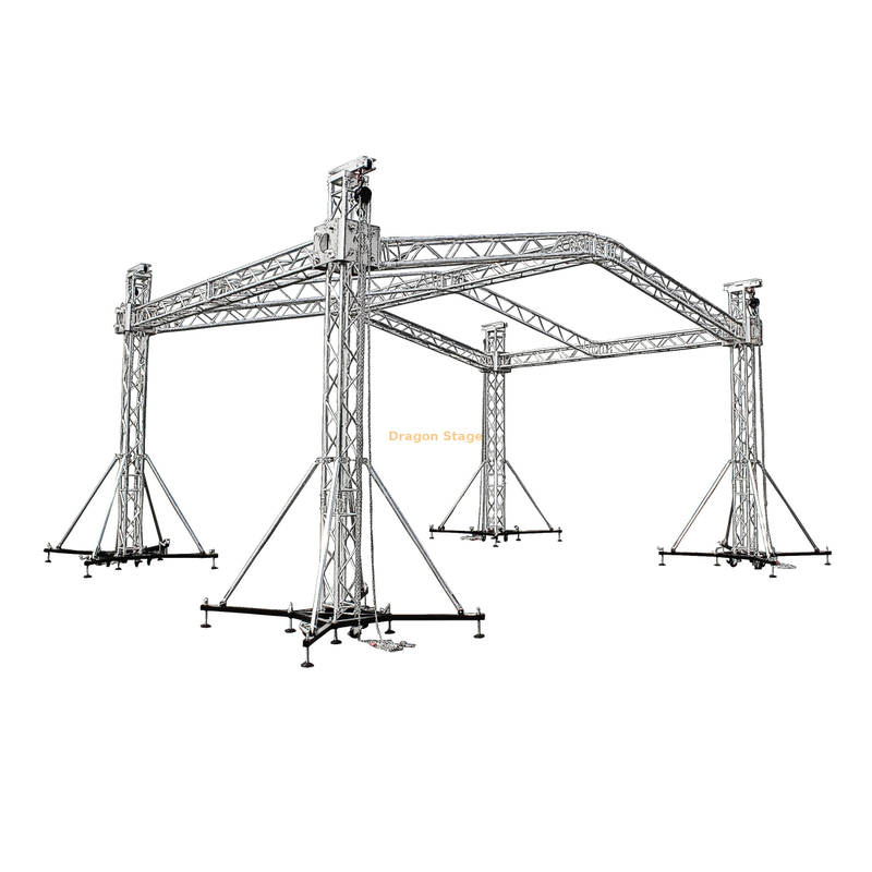 Une frustration courante pour les équipes d’événements en plein air est le risque d’accumulation d’eau sur la canopée du toit, ce qui peut ajouter un poids dangereux à la structure. DragonStage résout ce problème avec la géométrie Curved A-Roof ; l'arc naturel garantit que l'eau de pluie s'écoule immédiatement sur les côtés, protégeant ainsi les équipements d'éclairage et audio coûteux en dessous. Un autre défi est le risque de sécurité lié au gréage en hauteur. Notre solution comprend un système de tour de levage intégré. Cela permet à l'ensemble de la grille de 8 x 6 m d'être assemblée et équipée de luminaires au niveau de la taille avant d'être hissée en toute sécurité jusqu'à son sommet de 6 mètres. Pour les installations sur des terrains variés comme des parcs ou des champs de foire, le système comprend des vérins de nivellement réglables pour garantir une structure parfaitement stable et d'aplomb.