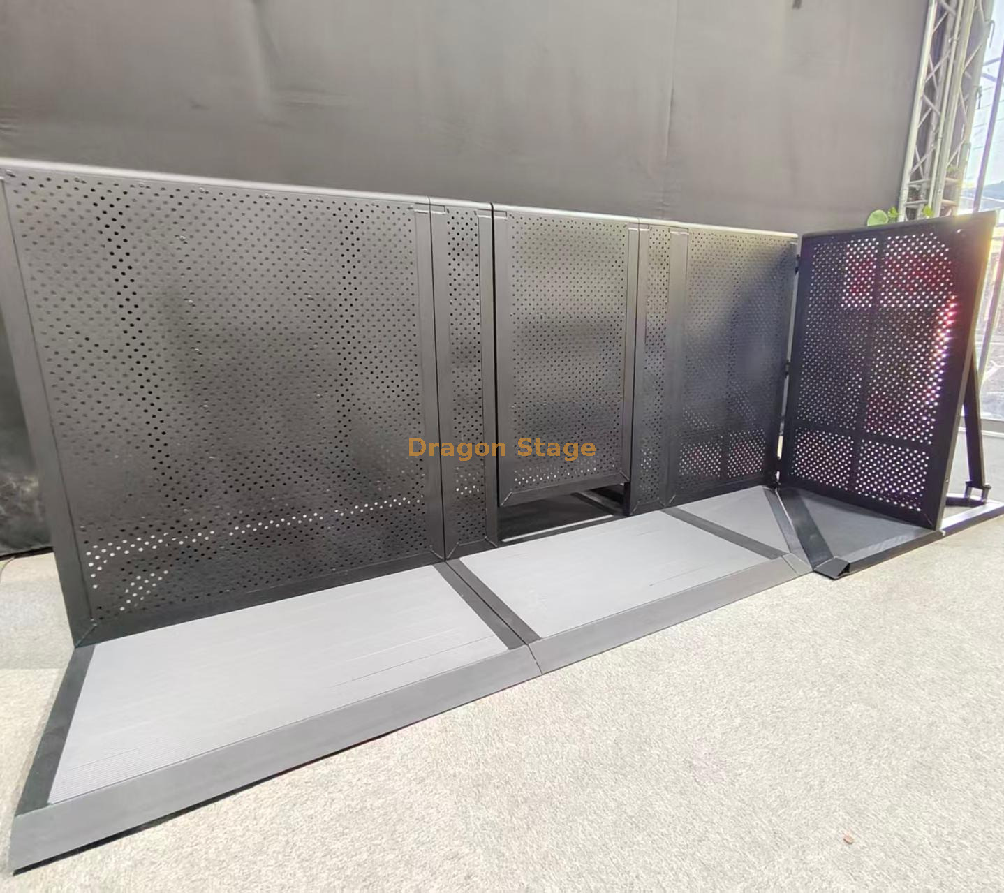 La plate-forme antidérapante intégrée permet au personnel de sécurité de se tenir en toute sécurité derrière la barrière, améliorant ainsi l'efficacité du contrôle et la vitesse de réponse. Cette conception est largement utilisée dans les environnements de tournées et de festivals, similaire aux systèmes appliqués aux systèmes de fermes de scène temporaires..