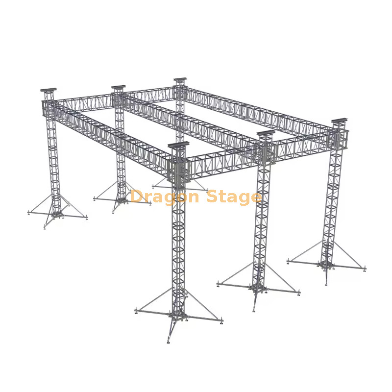 Dotée d'une impressionnante travée avant de 25 mètres avec une hauteur interne de 12 mètres et une profondeur de 14 mètres, cette structure au sol est entièrement construite à partir de fermes à broche en aluminium 6061 certifiées (sections robustes de 520 × 520 mm et 680 × 1010 mm) et offre une capacité de charge exceptionnelle - supportant facilement des murs vidéo LED géants, plusieurs clusters de sonorisation line-array et de vastes plates-formes d'éclairage et d'effets.