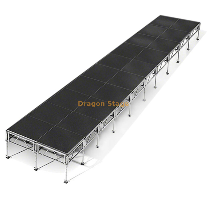 Élevez votre production avec le nec plus ultra en matière de mise en scène professionnelle. Ce système de scène extérieure tout terrain de 40 x 8 pieds (12,2 x 2,44 m) est conçu pour les événements à fort impact qui exigent à la fois stabilité et polyvalence. Que vous organisiez un grand concert, un défilé de mode élégant ou une allocution d'entreprise de haut niveau, ce système fournit une base solide et de niveau sur pratiquement toutes les surfaces, des parkings pavés à l'herbe et au gravier inégaux.