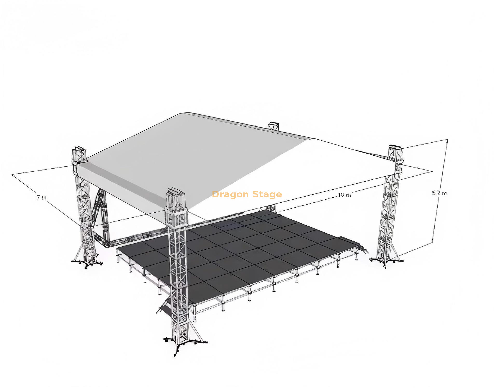 Pour fournir une solution complète de salle, cet auvent est conçu pour une intégration transparente avec nos plates-formes de scène modulaires en aluminium. Ces ponts présentent des surfaces antidérapantes de 18 mm et des capacités de charge élevées, offrant une base stable qui correspond à la qualité professionnelle de l'installation aérienne (Source : https://www.dragontruss.com/Aluminum-Stage-Platform-pd463987768.html ).
